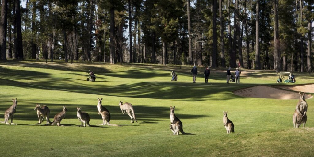 Se si gioca in Australia, è facile imbattersi in canguri che saltellano liberamente sui fairway. Al Sun City Country Club vicino a Perth, oppure al Angelsea Golf Club nello stato di Victoria, i branchi di canguri sono diventati parte integrante del paesaggio. Alcuni golfisti scherzano sul fatto che schivare un canguro in corsa sia più difficile che evitare un bunker. Non è raro vedere gruppi di animali fermarsi a osservare i giocatori prima di proseguire la loro tranquilla passeggiata.